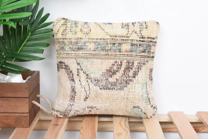 Handmade Green & Beige Patchwork Throw Pillow, Vintage 12x12 Linen Pillow