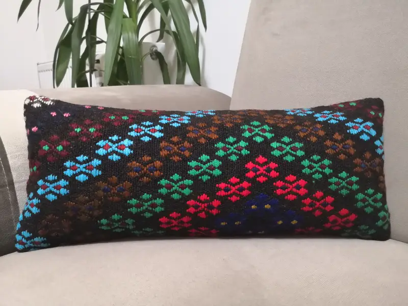 Handcrafted Blue & Green Rectangle Throw Pillow, Vintage Wool Pillow