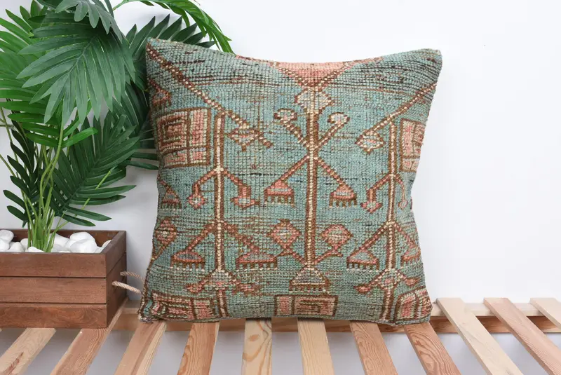 Green & Beige Floral Embroidered Throw Pillow, Vintage Handmade Cushion