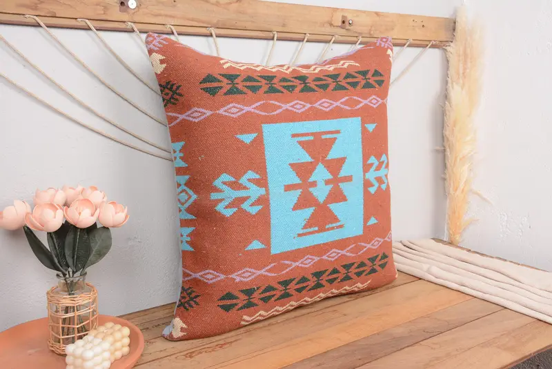 Brown & Green Geometric Throw Pillow, Vintage Embroidered Cushion