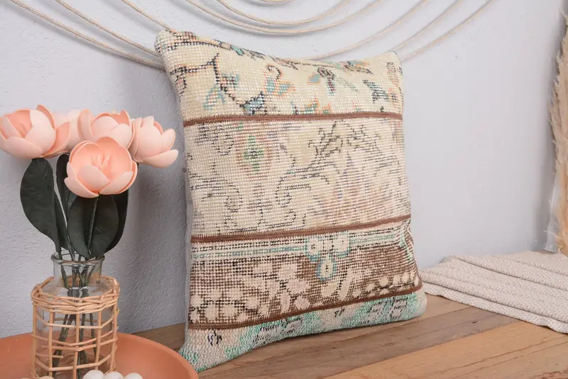 Beige & Brown Patchwork Throw Pillow, Vintage Embroidered Cushion
