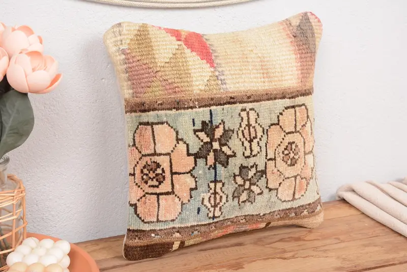 Green & Brown Patchwork Throw Pillow, 14x14 Embroidered Cushion