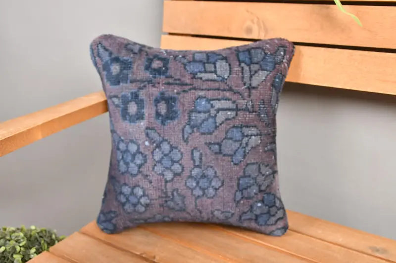 Blue & Gray Embroidered Floral Throw Pillow, Vintage Square Cushion