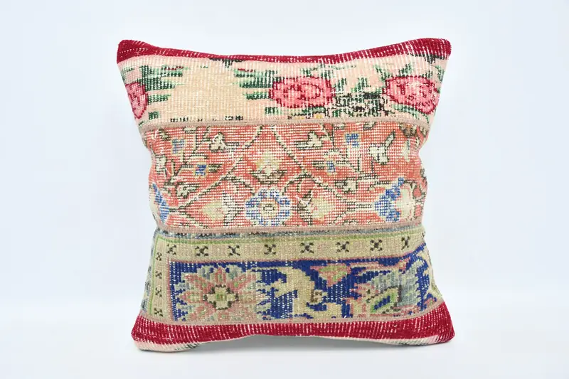 Red Hemp & Wool Patchwork Throw Pillow, Vintage Embroidered Pillow