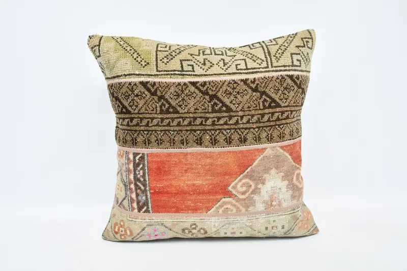 Brown & Red Patchwork Throw Pillow, Vintage Hemp & Wool Pillow