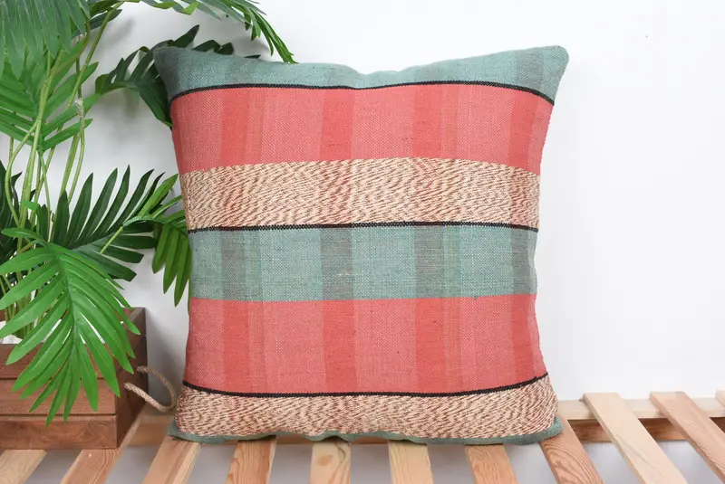 Red & Gray Striped Throw Pillow, Embroidered Vintage Cushion