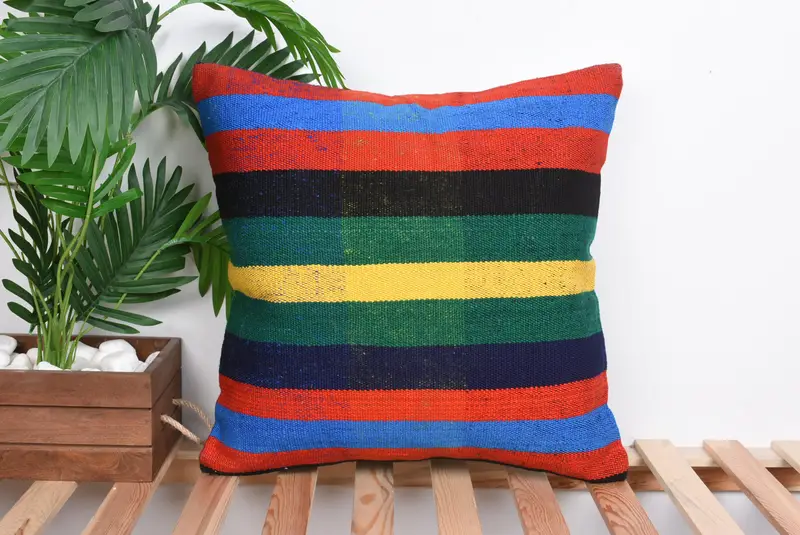Green & Red Striped Linen Throw Pillow, Vintage Embroidered Cushion