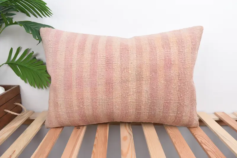 Beige & Pink Striped Pillow, 16x24 Embroidered Throw Pillow