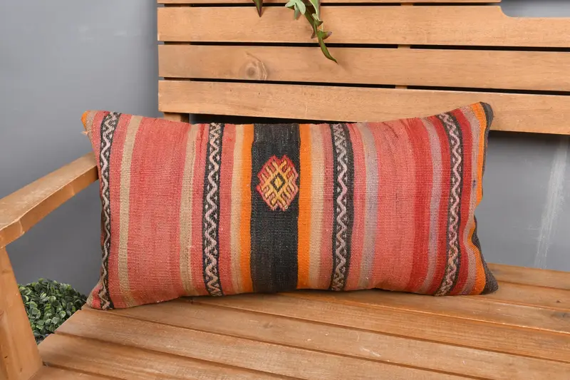 Red & Brown Geometric Throw Pillow, Handmade 12x24 Linen Cushion