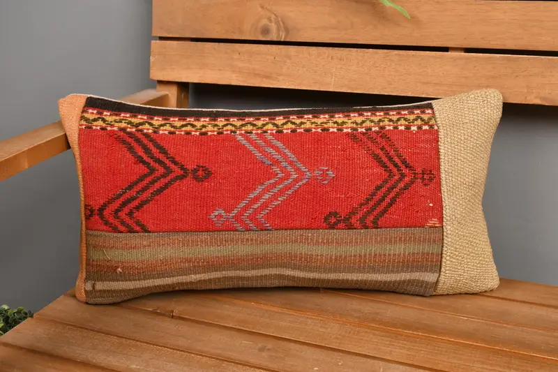 Red & Brown Geometric Throw Pillow, Handmade Linen & Wool Rectangle Pillow