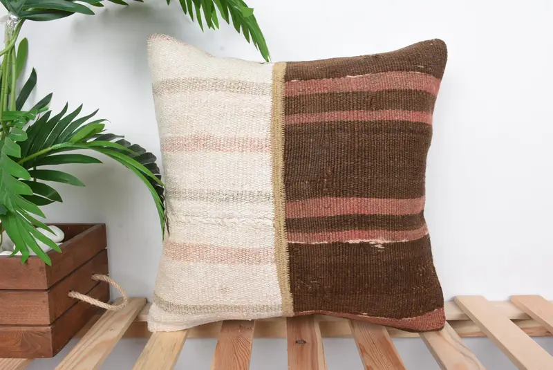 Embroidered Beige & Brown Pillow, 16x16 Vintage Throw Pillow