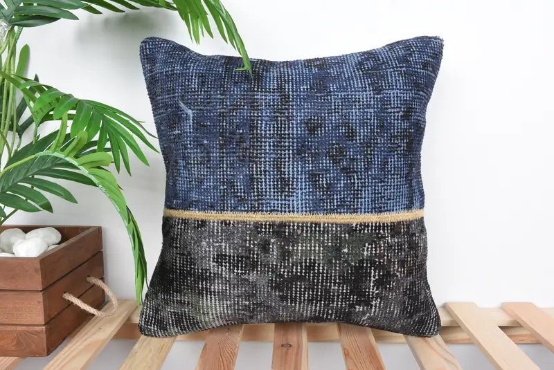 Blue & Brown Patchwork Throw Pillow, 16x16 Vintage Cushion