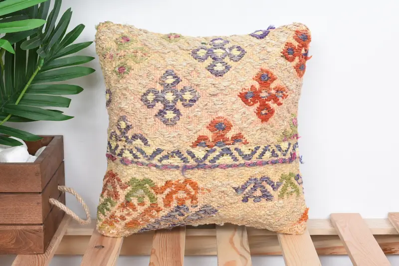 Beige & Red Embroidered Throw Pillow, Vintage Floral Decor Pillow