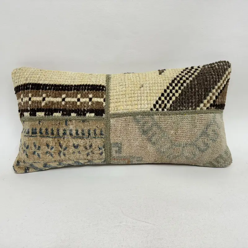 Beige & Brown Patchwork Throw Pillow, 10x20 Embroidered Cushion