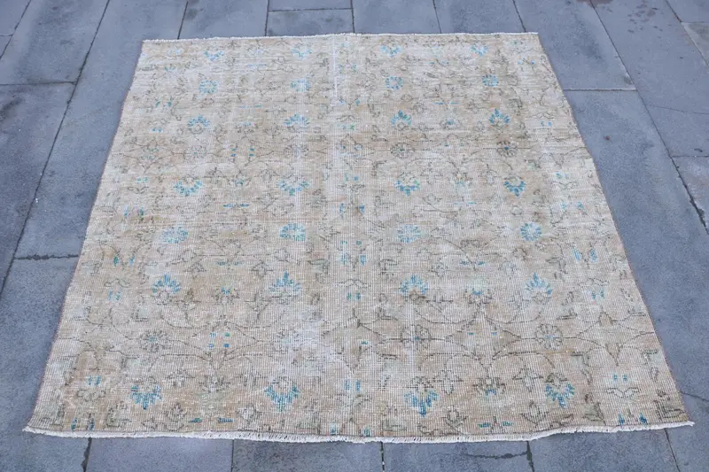 Elegant Beige Rug, 4.5x4.3 ft Geometric with Floral Motifs