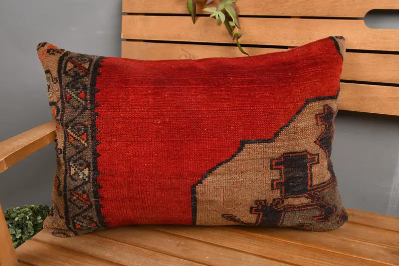 Red & Brown Floral Embroidered Throw Pillow, 16x24 Handmade Linen Pillow
