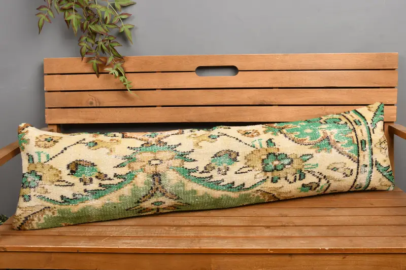Handmade Green & Beige Floral Throw Pillow, 12x48 Vintage Rectangle Pillow