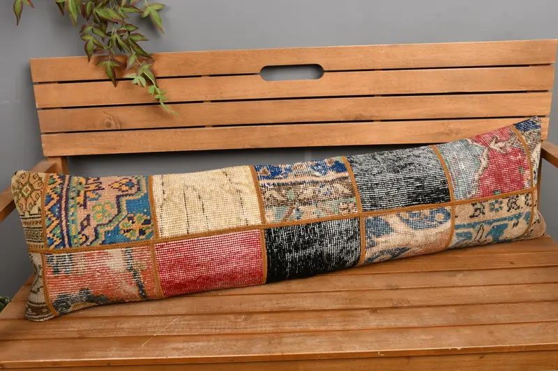 Red & Black Patchwork Throw Pillow, 12x48 Embroidered Vintage Pillow
