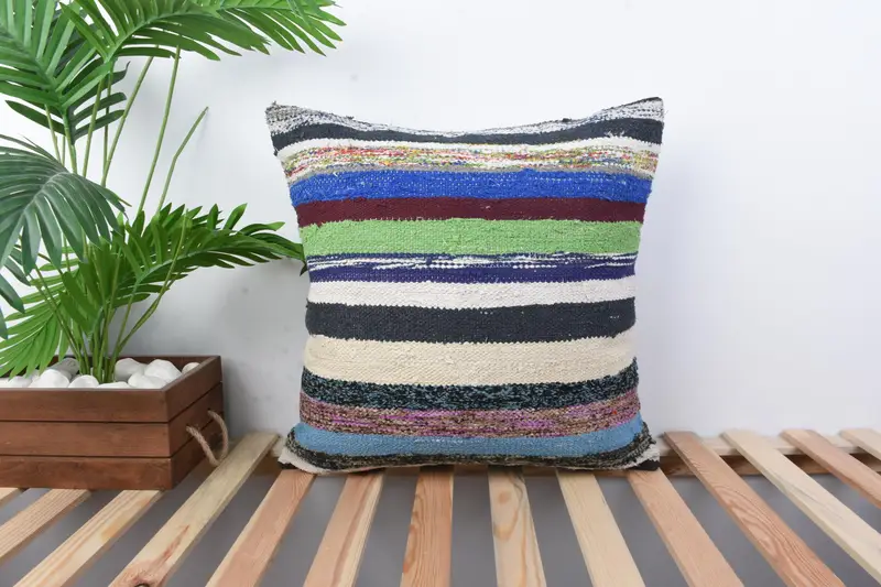 Blue & Green Striped Throw Pillow, Embroidered Vintage Pillow