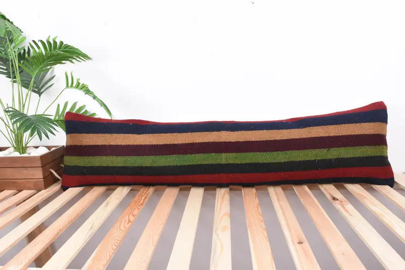 Red & Green Striped Throw Pillow, 12x48 Embroidered Cushion