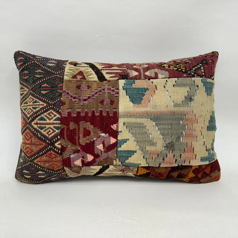 Beige & Red Patchwork Throw Pillow, 16x24 Embroidered Cushion