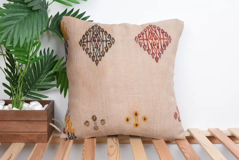 Geometric Beige & Brown Embroidered Pillow, Vintage Throw Pillow