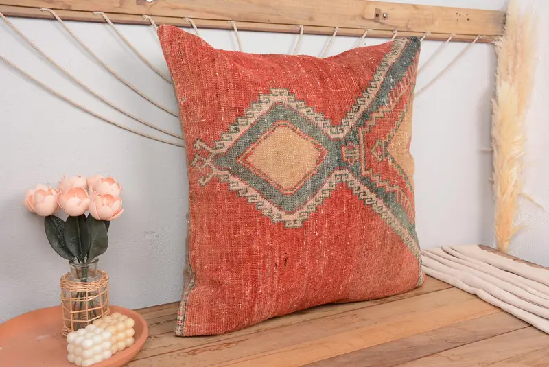Red & Green Embroidered Throw Pillow, 28x28 Vintage Floral Cushion