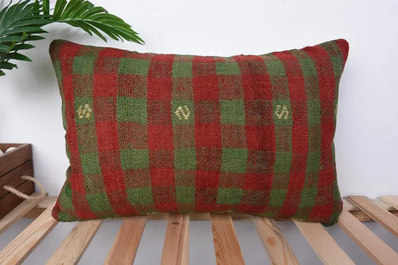 Green & Red Striped Throw Pillow, Vintage Embroidered Pillow