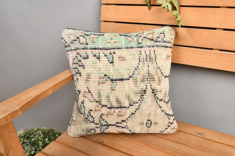 Embroidered Beige & Brown Floral Throw Pillow, 14x14 Handmade Cushion