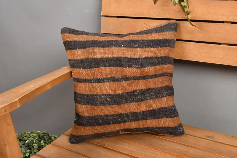 Brown & Red Striped Throw Pillow, Vintage Embroidered Cushion