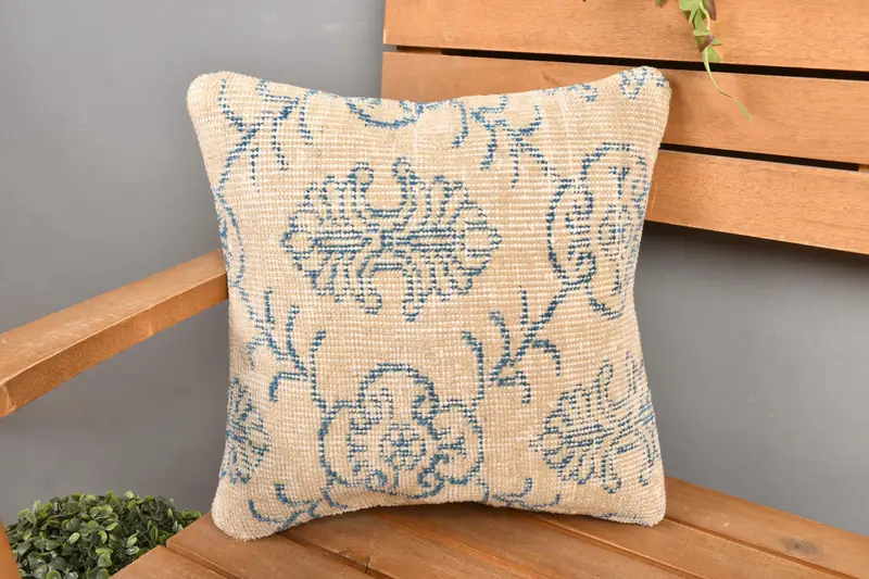 Beige, Green Floral Embroidered Throw Pillow, 14x14 Vintage Cushion