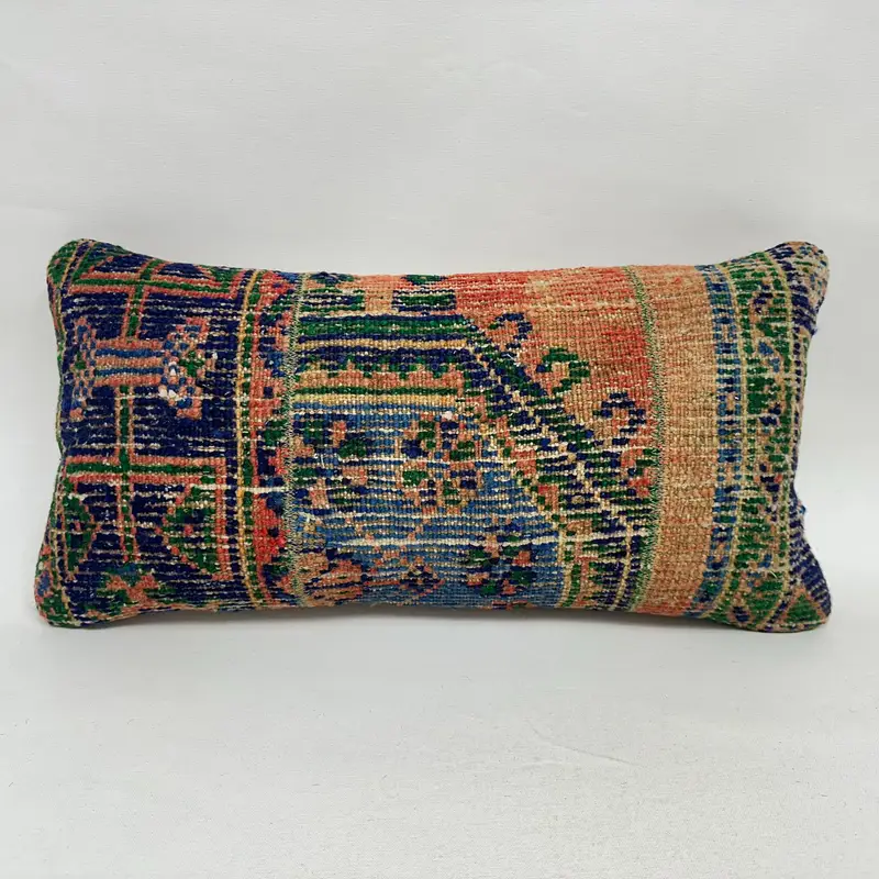Blue & Orange Patchwork Throw Pillow, 12x24 Embroidered Vintage Cushion