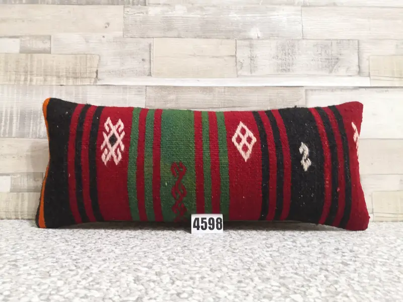 Rectangular Red & Green Striped Wool Pillow, Vintage Throw Pillow