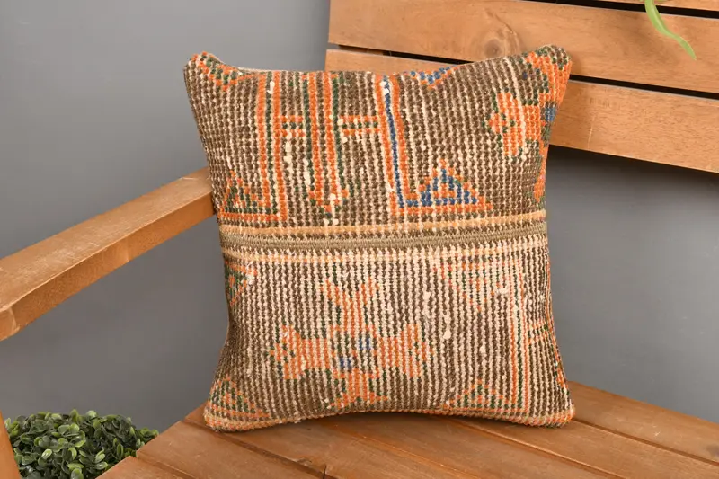 Embroidered Patchwork Throw Pillow, Vintage Brown & Orange Cushion