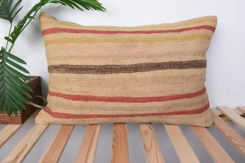 Beige & Brown Striped Throw Pillow, Vintage Embroidered Pillow