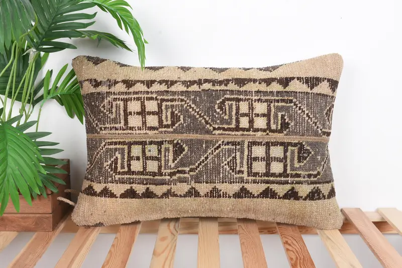 Geometric Brown & Beige Linen Pillow, 16x24 Handmade Throw Pillow