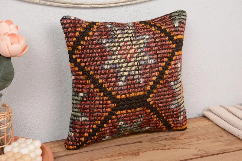 Red Kilim Pillow with Geometric Pattern, 14x14 Vintage Throw Pillow