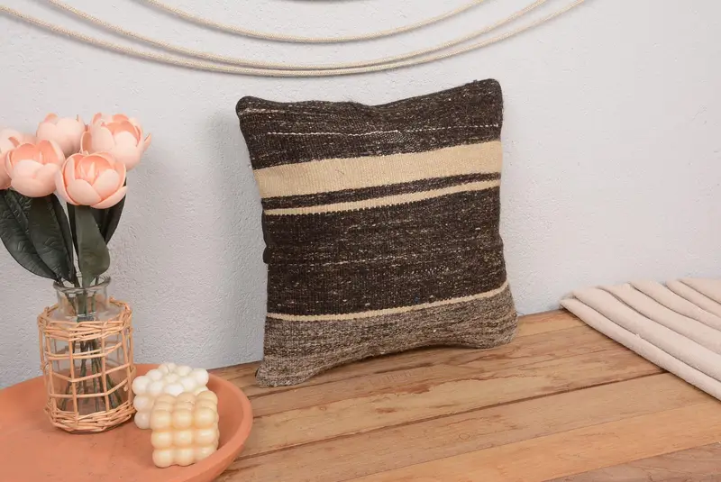Brown & Beige Striped Throw Pillow, Embroidered Vintage Cushion