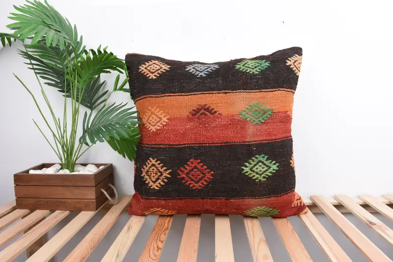 Red & Brown Striped Throw Pillow, Vintage Embroidered Cushion