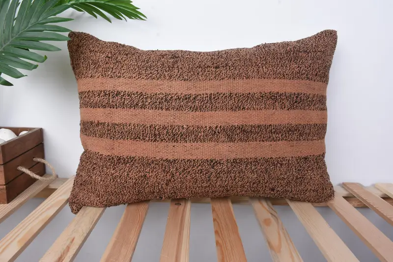Brown Striped Throw Pillow, 16x24 Embroidered Linen Pillow