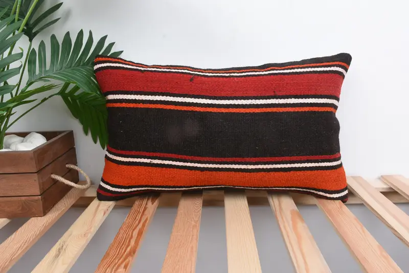 Orange & Brown Striped Throw Pillow, Vintage Embroidered Cushion