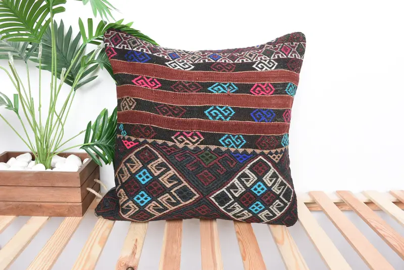 Red & Green Striped Throw Pillow, 22x22 Embroidered Linen Pillow