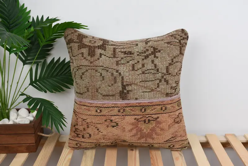 Brown & Beige Patchwork Throw Pillow, Embroidered Vintage Cushion