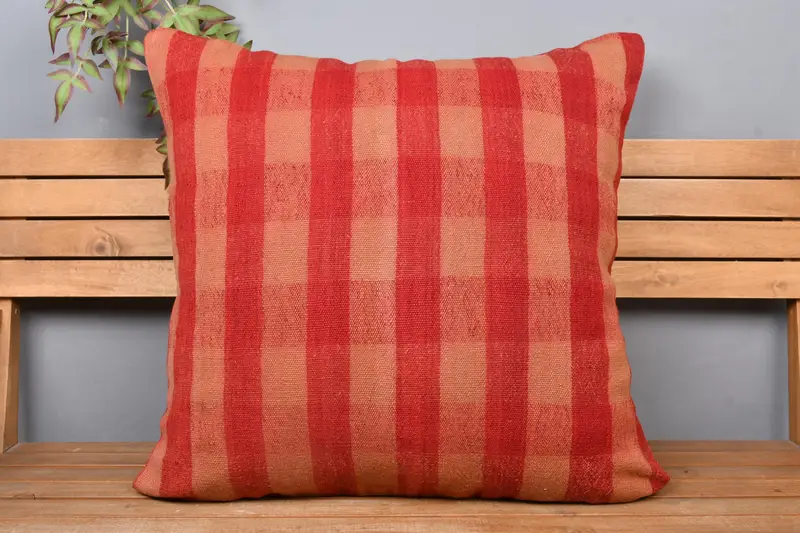 Red & Beige Striped Throw Pillow, Vintage Embroidered Cushion
