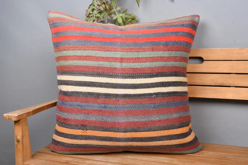 Blue & Red Striped Throw Pillow, 28x28 Embroidered Cushion