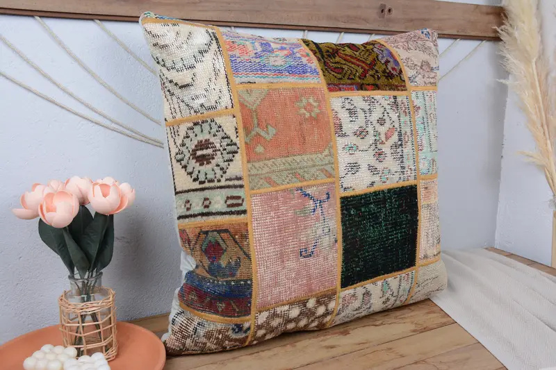 Beige & Brown Patchwork Throw Pillow, Vintage Embroidered Cushion
