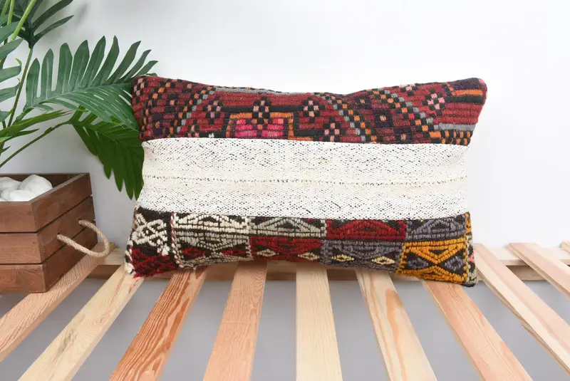Red & Beige Patchwork Throw Pillow, 12x20 Embroidered Cushion