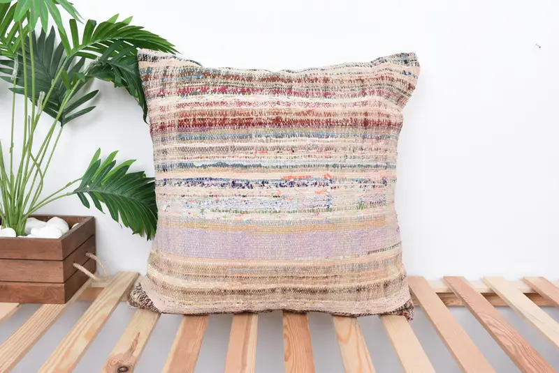 Handwoven Striped Linen Throw Pillow, Red & Brown Embroidered Cushion