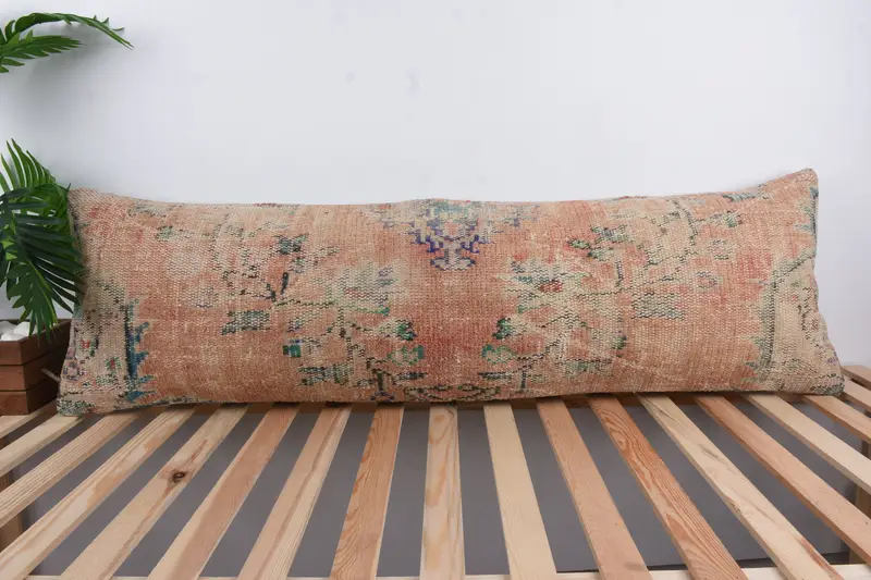 Red Hemp Throw Pillow with Bronze Floral Pattern, 16x60 Vintage Rectangle Pillow