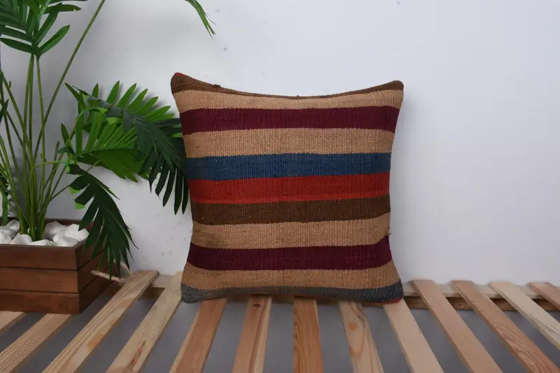 Red, Beige Striped Throw Pillow, 18x18 Embroidered Vintage Cushion